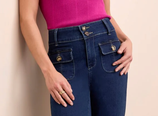 Refine your everyday wardrobe with our fashion statement jeans, designed with a flowing palazzo leg and sophisticated crease detail that enhances your silhouette. The fitted upper flatters your figure, while the zip and horn button closure add timeless elegance. Crafted with stretch denim, they offer luxurious comfort and flexibility, ensuring effortless style from day to night.