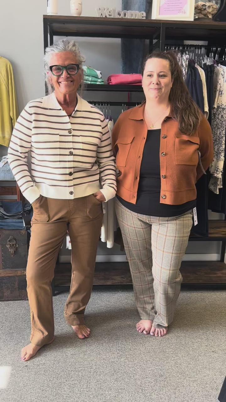 Complete your look with a polished touch in this cozy cardigan, featuring a playful stripe pattern or solid color with a refined collar. The double-knit jacquard fabric offers warmth, while accent chest pockets add a charming, functional detail.