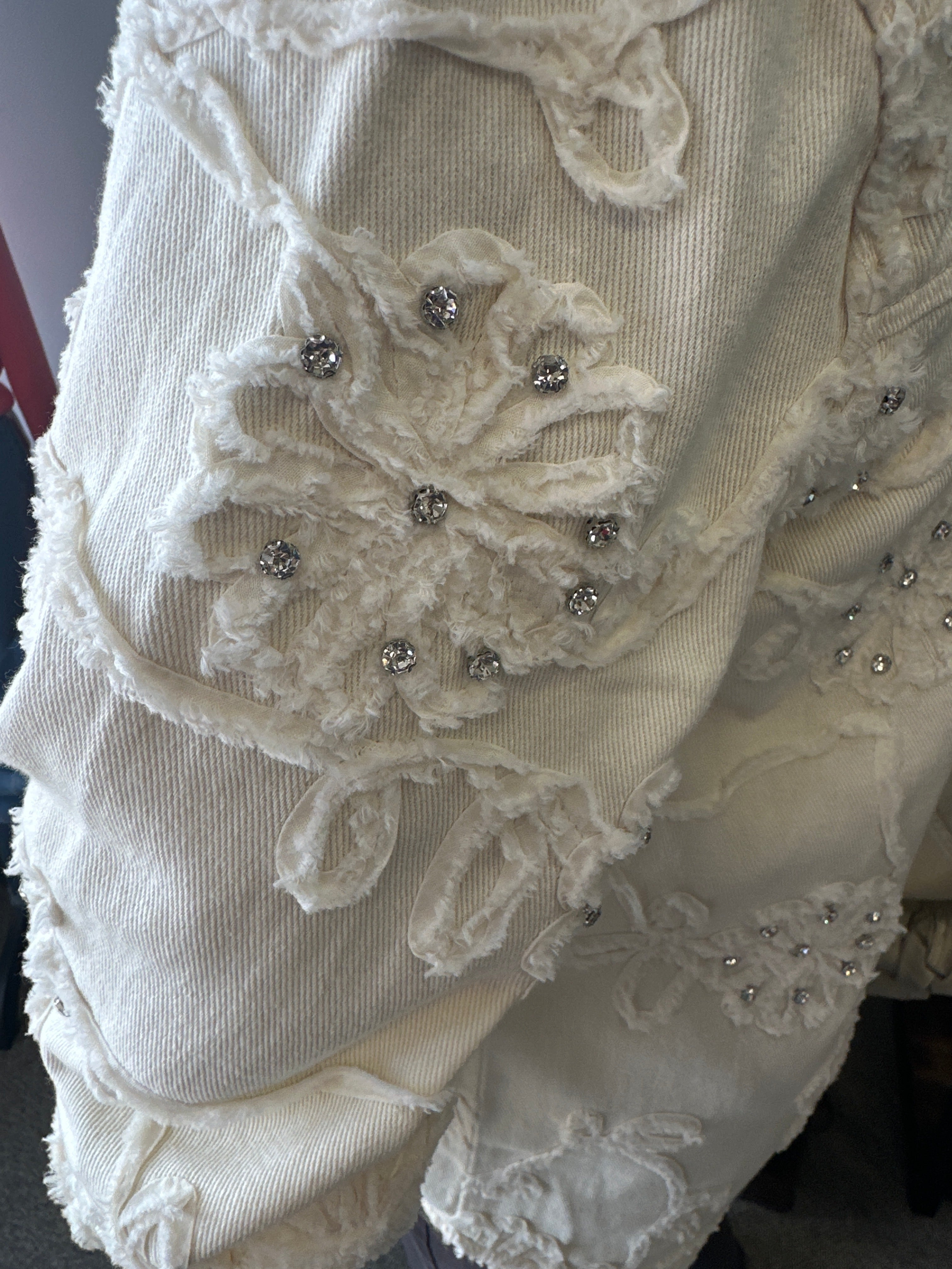- Fancy applique and rhinestone detail