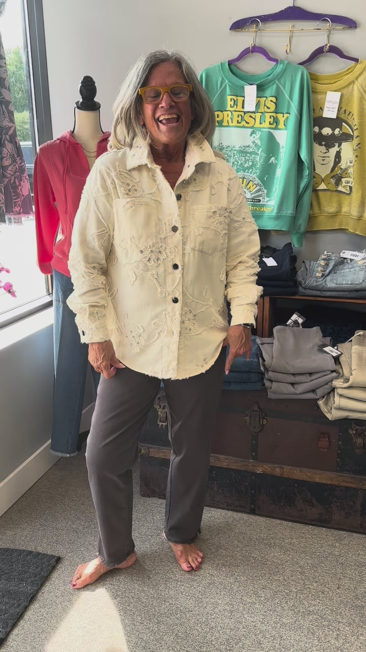 Elevate your off-duty wardrobe with a fashion-forward shacket, featuring intricate appliqué and subtle stone embellishments that add a touch of refined glamour. Tailored from textured twill for a structured silhouette, it's finished with a sharp collar that lends a polished, timeless edge to the look. Buttoned front with collared neckline