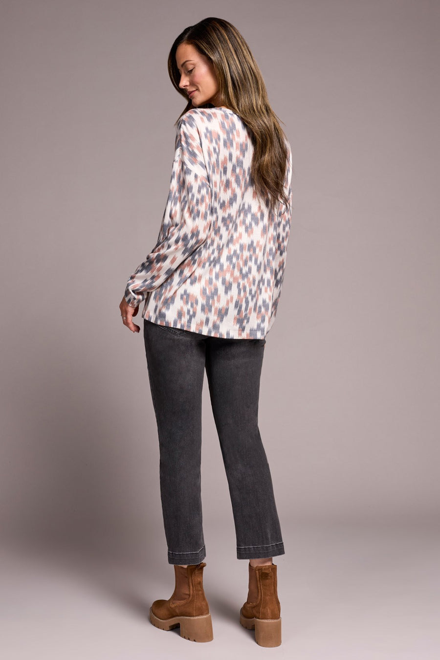 Embrace bold statement style with this long-sleeve top, featuring a relaxed loose fit and drop shoulders for effortless comfort. Crafted from printed fuzzy knit, it offers inviting warmth on cooler days. The striking print and contrasting sleeves lend a vibrant touch, elevating your ensemble with contemporary flair.