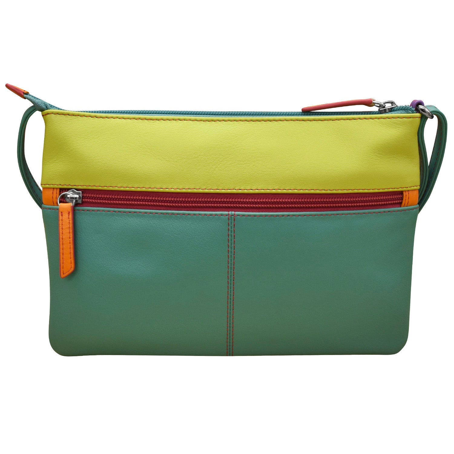 An awesome variety of colors within a purse; burgundy/reddish or forest green, with a double zip color block, crossbody option in a smooth leather, adjustable strap and triple entry, back and inside pockets AND RFID blocking.