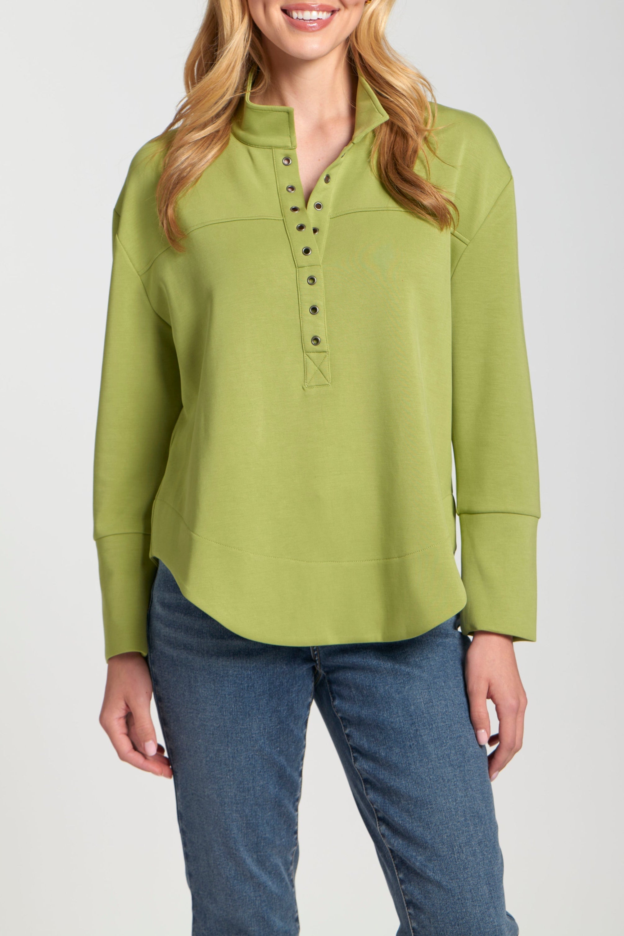 Stay cozy and stylish in this effortlessly cool pullover, designed in a refreshing citron hue. Featuring a mock neck collar with a bold snap-button half placket, it brings a sporty-chic vibe to your everyday look. The drop shoulder long sleeves provide a relaxed fit, while the wide cuffed ends add a touch of structure. Finished with a rounded high-low hemline, this pullover offers extra coverage and flattering shape—perfect for pairing with your favorite denim or leggings for a laid-back, polished ensemble.