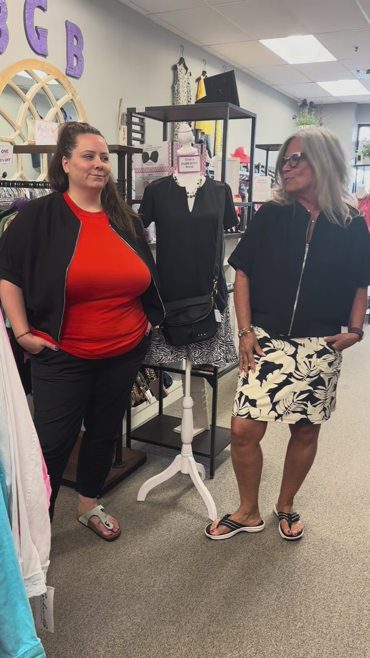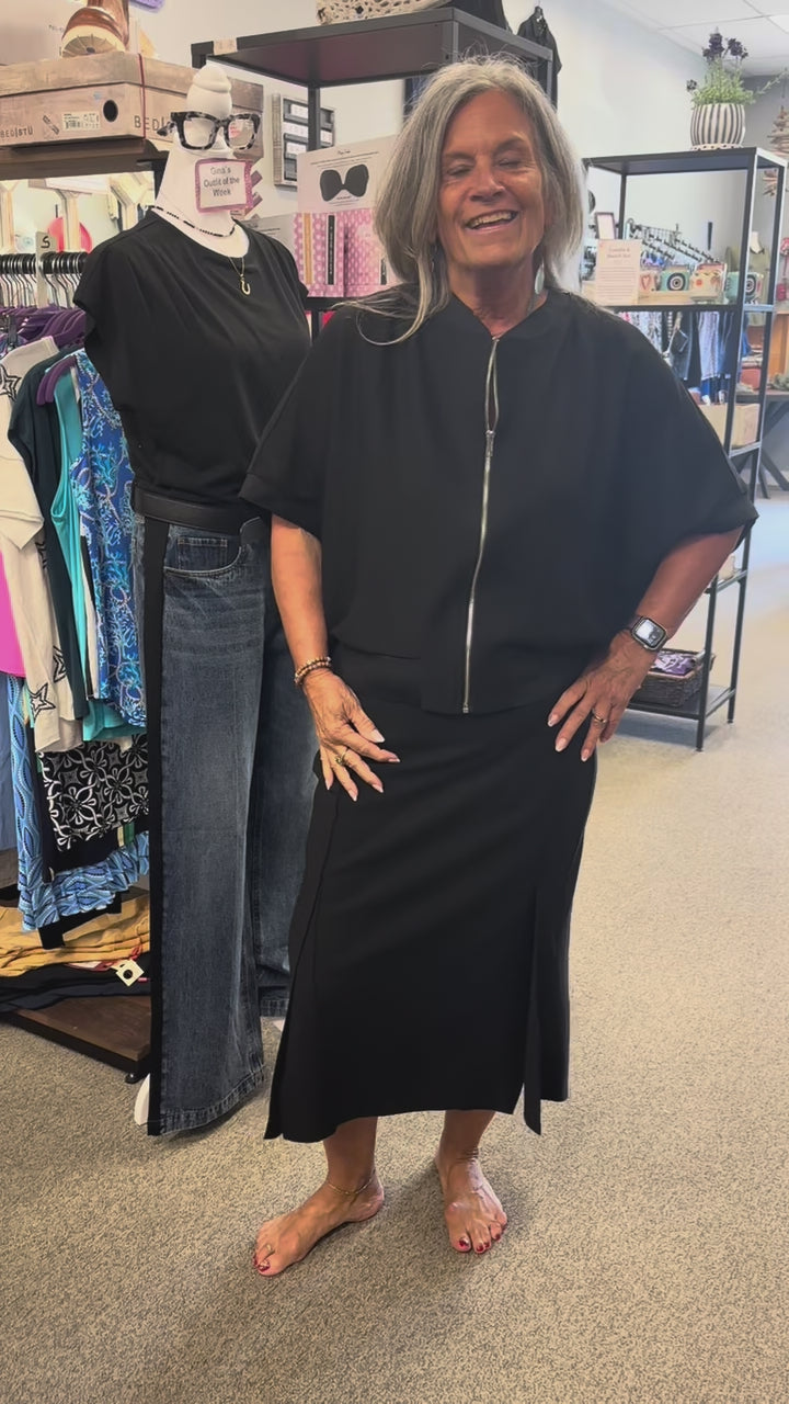 Live in style with our Katy Zipper Jacket. A sleek jacket made with high quality stretch matte crepe knit, zip closure, elastic waist, 3/4 sleeves with great comfort and style.