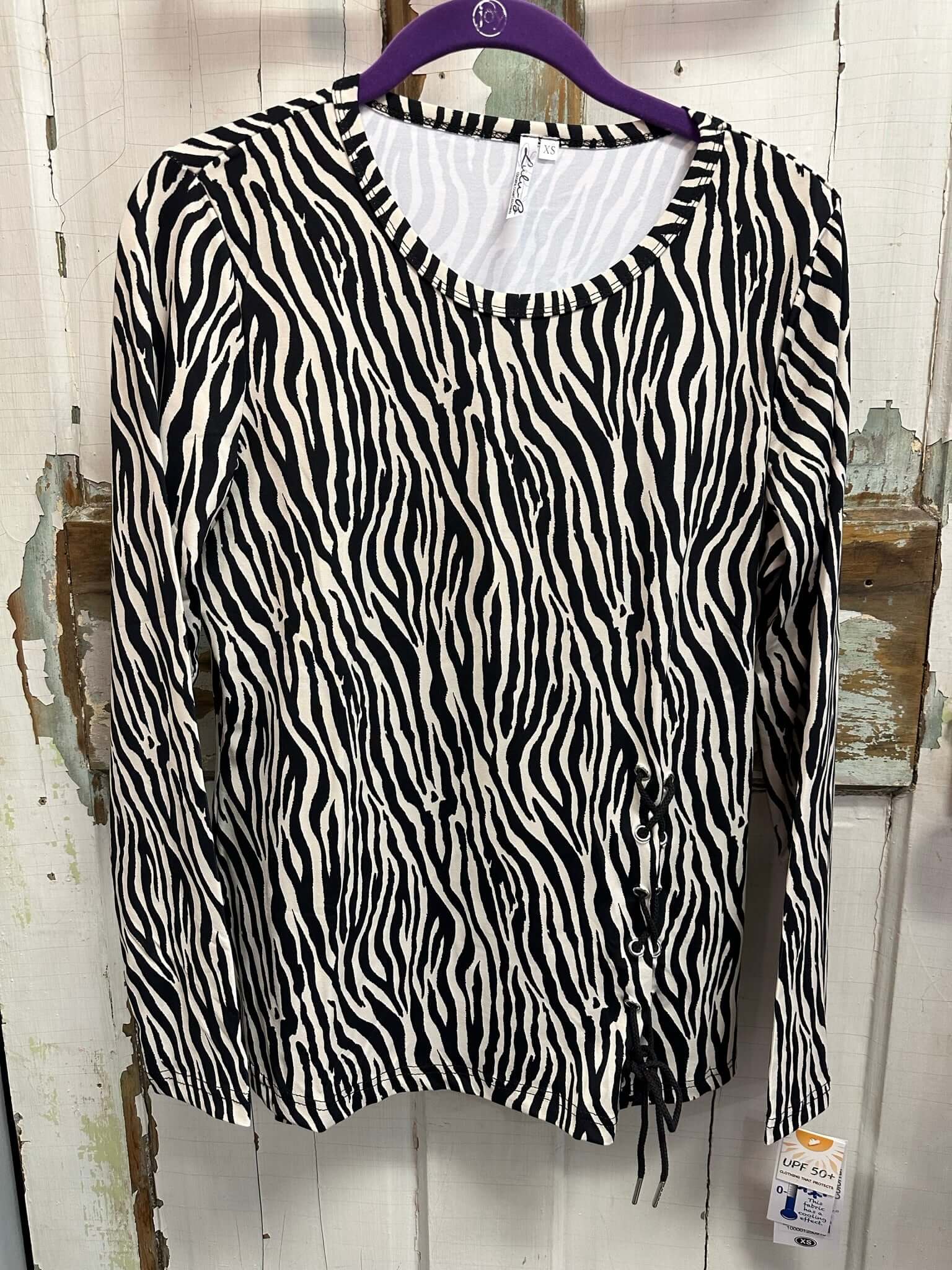 Let's get sassy! This round neck long sleeve top, in a zebra print, has an adorable lace up on the side, that is adjustable. Soft and fun.