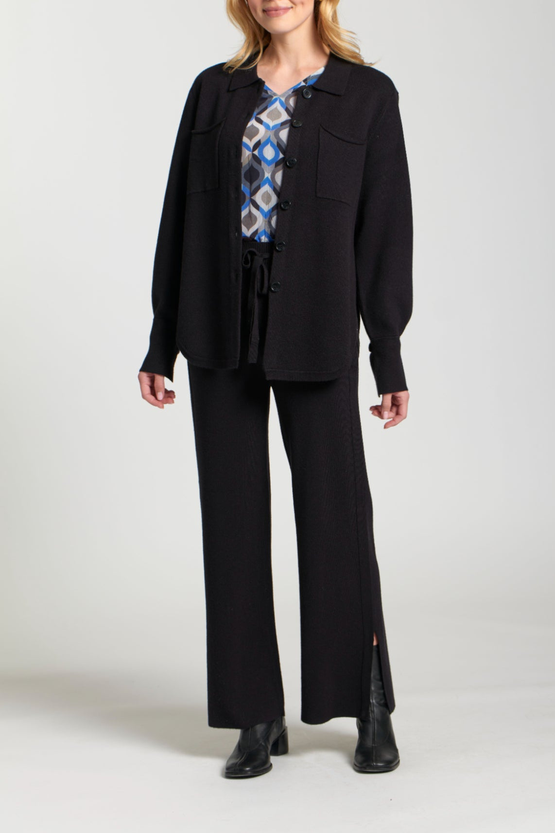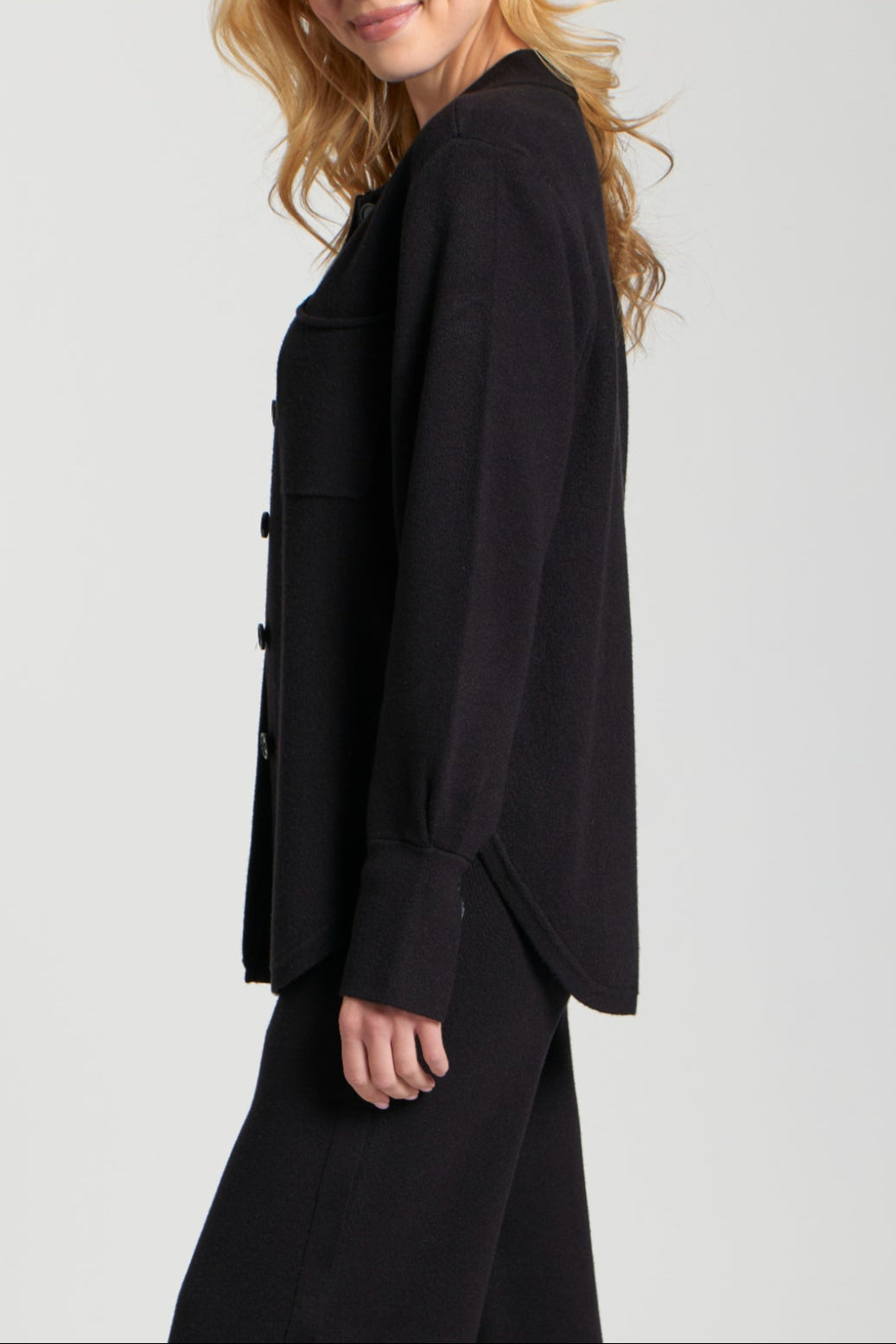 Stay effortlessly polished with this versatile button-up shirt jacket. Crafted from a soft knit fabric, it features a relaxed fit with a structured collar, full button-front closure, and two flap chest pockets for a touch of utility style. The long sleeves with button cuffs and slightly dropped shoulders add to its laid-back yet refined silhouette. Perfect for layering, this piece can be worn as a lightweight jacket or styled as a shirt over your favorite top.
