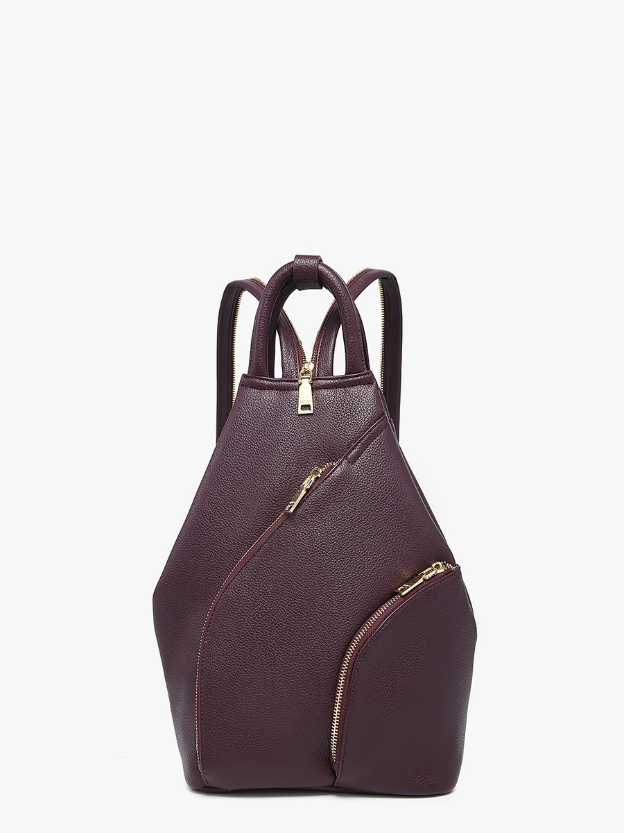 The Maura diagonal zipper backpack offers the perfect blend of style and functionality, making it an ideal choice for those who need a sleek yet spacious bag. Adjustable zippered strap allows for single or double-strap wear, vertical zip closure, two front zip pockets and a back zip pocket for organized storage and snap closure dual handles.