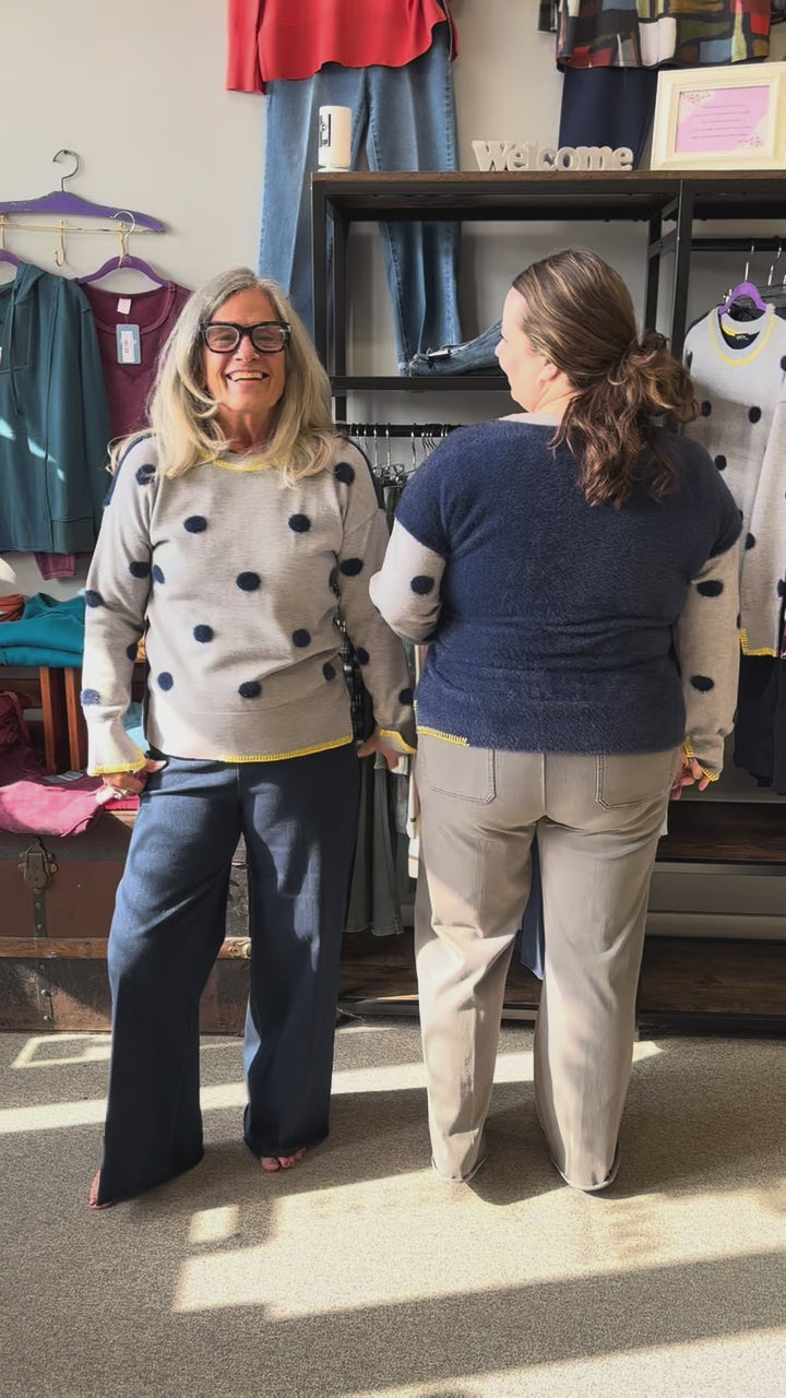 Add playful charm to your wardrobe with this cozy polka dot sweater. Designed with a crew neckline and pullover style, it features a soft grey base adorned with navy fuzzy dot detailing throughout. The contrasting yellow ribbed trim at the neckline, cuffs, and hemline adds a fun pop of color, elevating this casual piece with a touch of uniqueness. Perfect for relaxed, everyday looks with a cheerful twist.