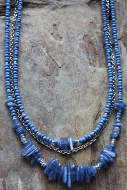 Handcrafted by artisans from the Black Hills of South Dakota. Three strands of denim colored gemstones, beads and a stainless steel chain. This stone is known to encourage communication and self-expression. Measures 22″ including a 4″ extender and lobster claw clasp. Each piece is unique and may vary slightly.