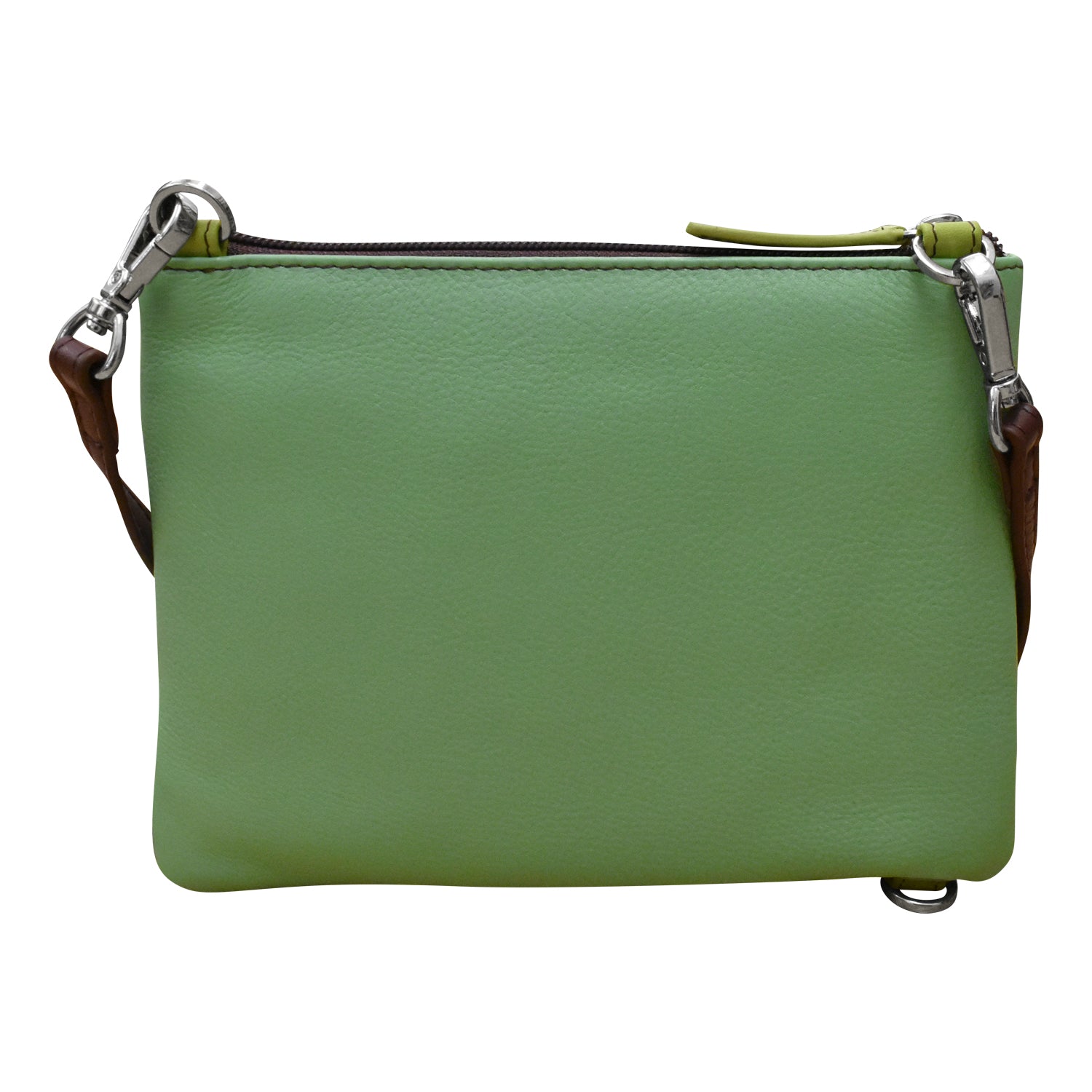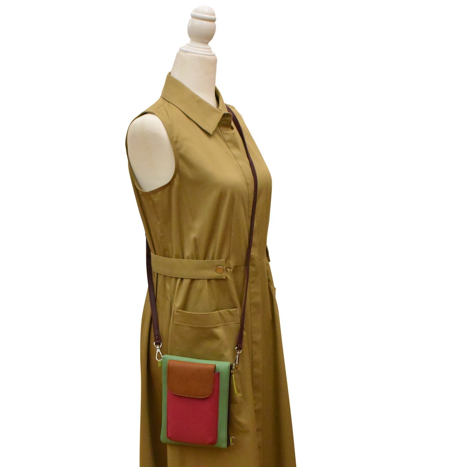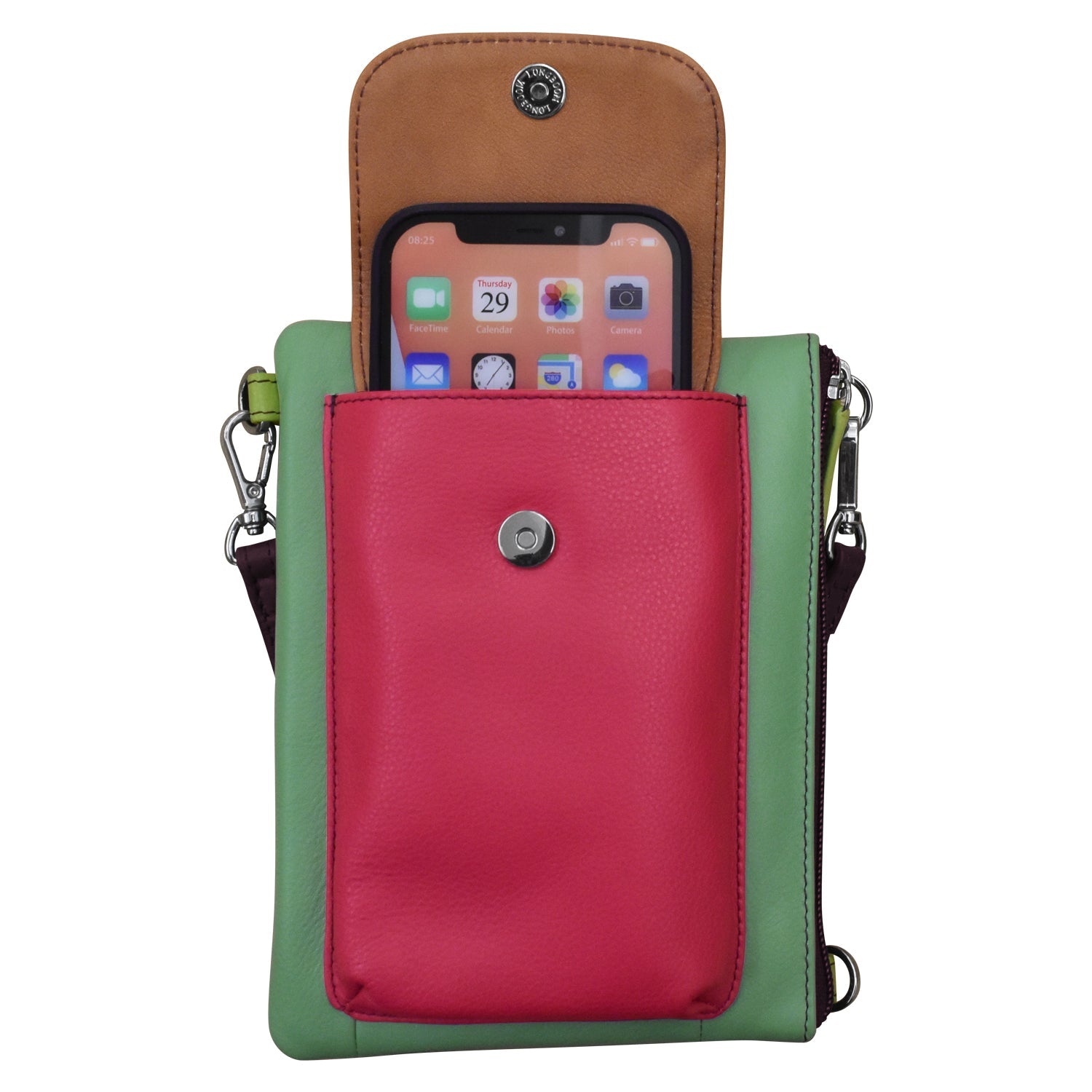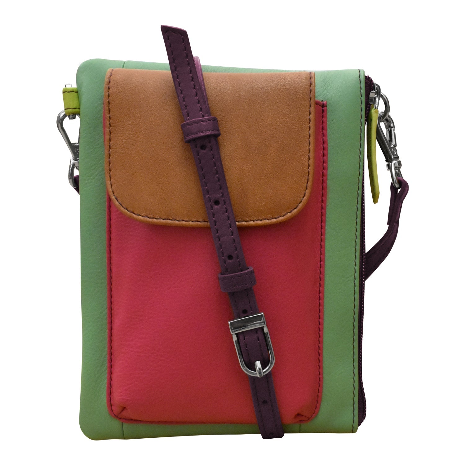Smooth leather crossbody organizer with a removable and adjustable strap, RFID blocking, front phone pocket with flap closure and top zip closure.